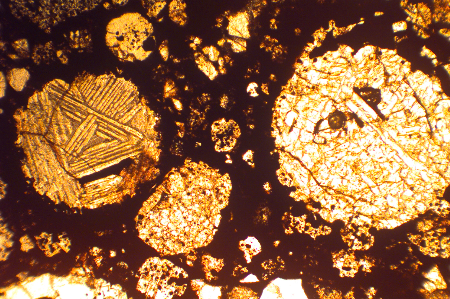 The large circular features in this image are chondrules. They are generally believed to have been formed as molten droplets is space and were subsequently incorporated into an asteroid. Have a look at the thin-section of Pontllyfini on the Virtual Mircroscope and see if you can spot any of these objects. (Image: Richard Greenwood, plane polarized light, field of view ~ 1mm)