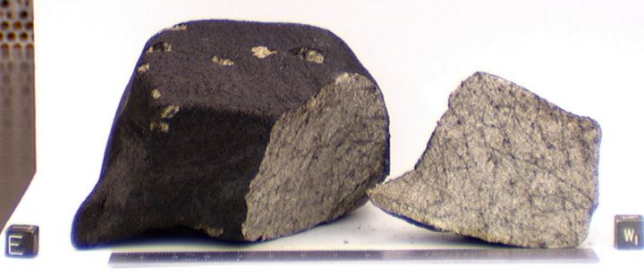 Fusion crust is a thin, dark, glassy layer on the outside of a meteorite that forms due to melting as a result of frictional heating during deceleration in the Earth’s atmosphere. (image: NASA)